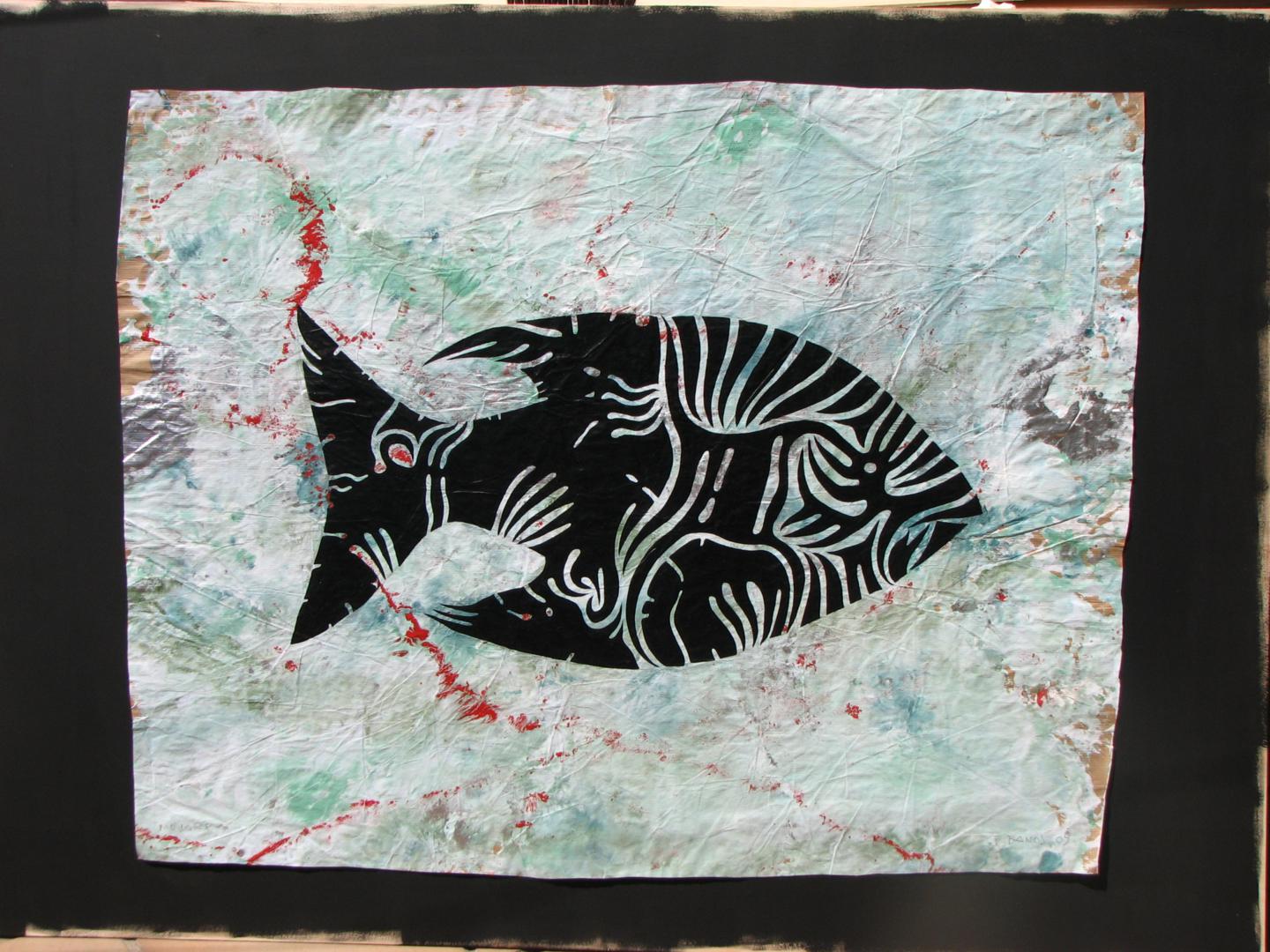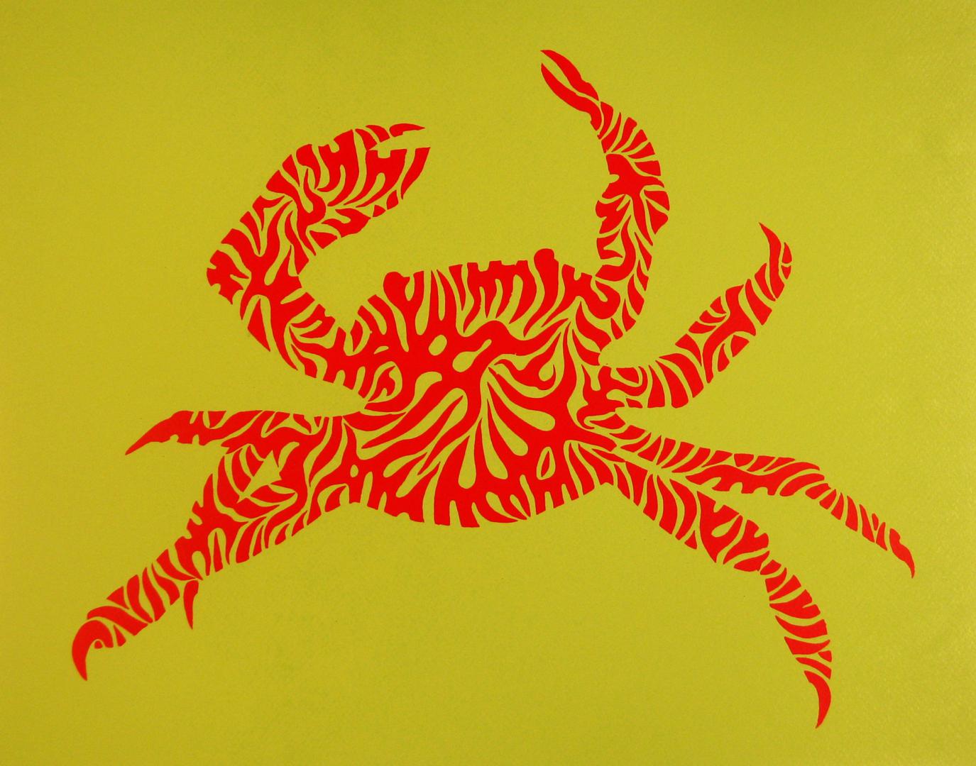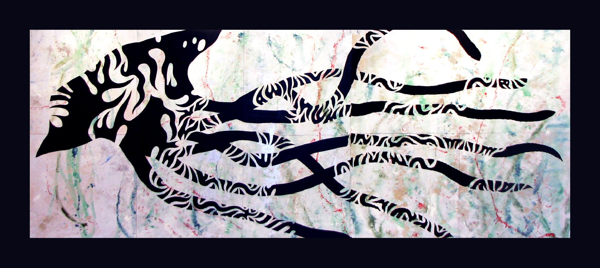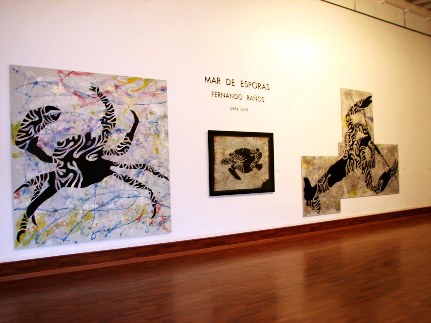 Cuando hablamos del mar, quizá podamos recordarlo como una imagen estática, que corta el horizonte con ese inamovible nivel azul (o de cualquier otro maravilloso color, según las horas del día y los fenómenos atmosféricos) pero es realmente el medio, como sabemos, más vivo y con más movimiento que existe. Es precisamente el movimiento, de donde parto con esta serie que titulo “Mar de esporas”, simbólica en cuanto a pretexto utilizado, pero abstracta de base, ya que la enlazo con otra serie anterior llamada Esporas, en esta serie aglutino las formas de espora, para crear toda una serie de animales, que se relacionan con el mar, son obras de grandes formatos sobre DM, papel o incluso serigrafías donde el color es el protagonista, la serie se expuso en la Universidad de Huelva y en el Baluarte de la Candelaria de Cádiz.