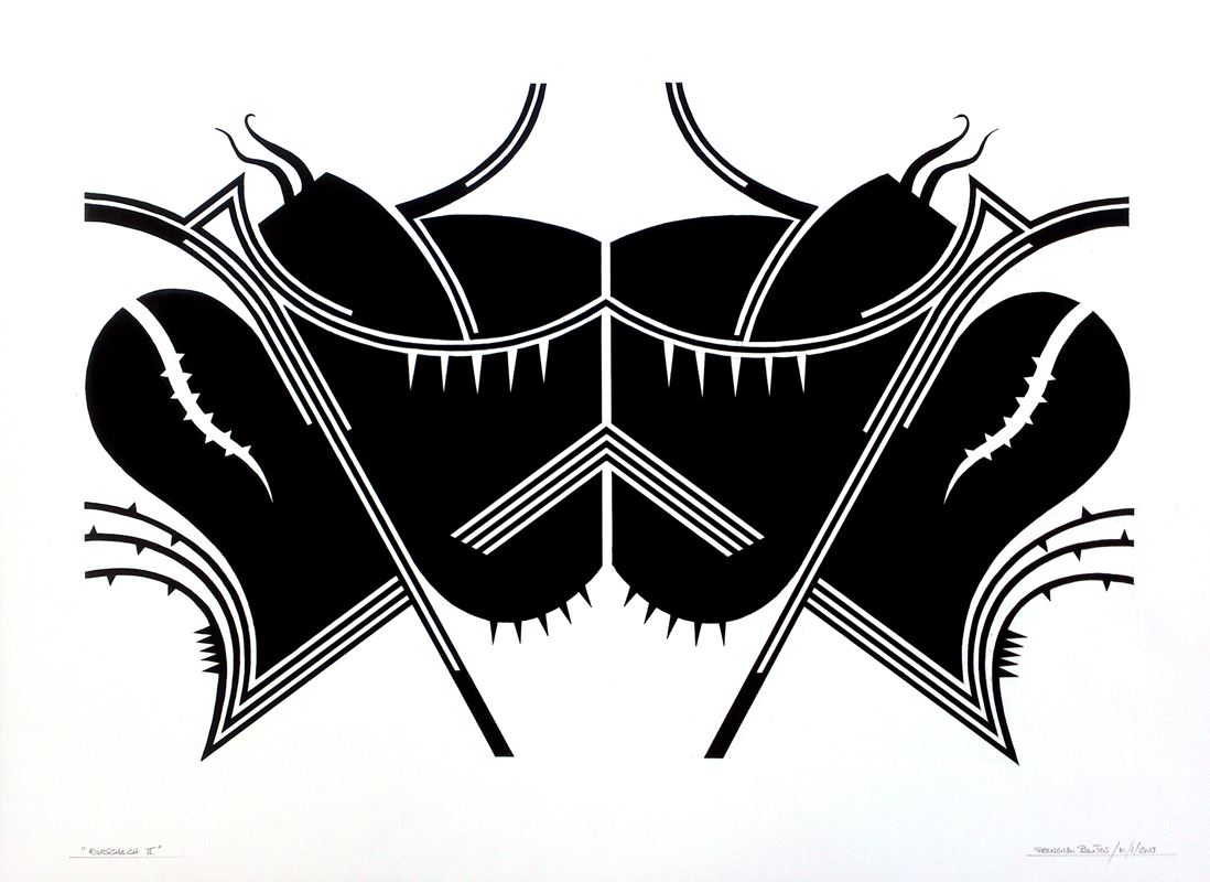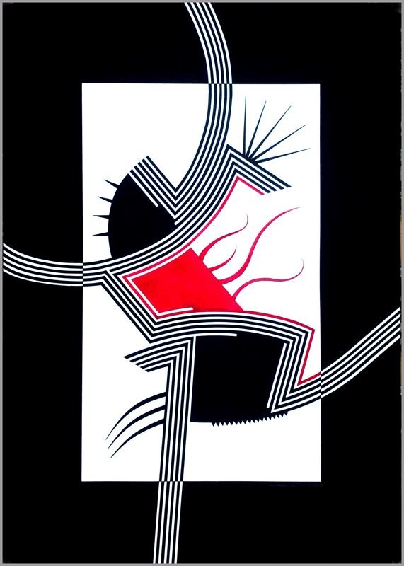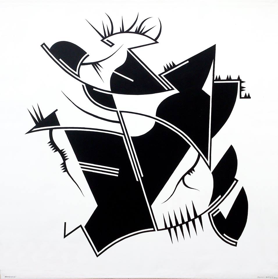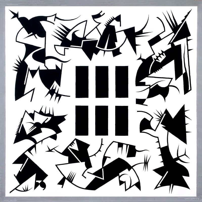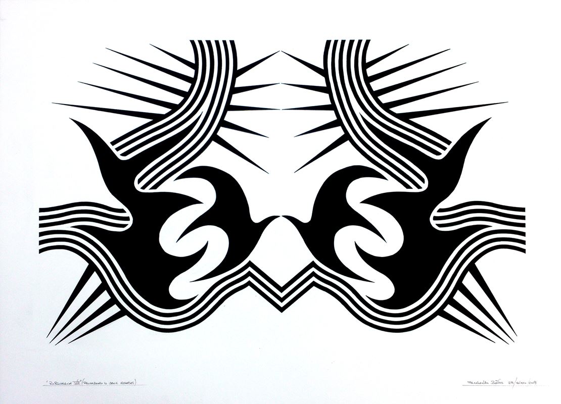 En este nuevo año, esta serie se diversifica en otras donde los conceptos y los divertimentos se mezclan de una forma poco ortodoxa, así surgen series como “Carmina Burana” formada por cuatro obras con igual estructura de base y el espíritu de rompimiento clerical que supuso dicha composición coral. La serie “Rorschach” aquí se juega con el concepto de espejo que supuso dichos test, pero ironizándolos mediante una geometría como antítesis de su abstracción gestual. Serie “Claustros”, es una serie de obras de composición cerrada en torno a unas formas geométricas de gran movimiento que invade ese marco que las encierra y que conceptualmente, podría ser esos enigmáticos pasillos que encierran el patio central de los conventos, por ultimo dos series en proyecto “Cultos” y “Cretonas”; la primera referente a esas películas de culto de principios del cine mudo de las cuales extraigo imágenes con las que juego de forma tramada sobre plancha de hierro y la segunda se trata de telas de flores estampadas sobre las que impresiono por medio de serigrafía y acrílico diversas composiciones en formatos cuadrados.